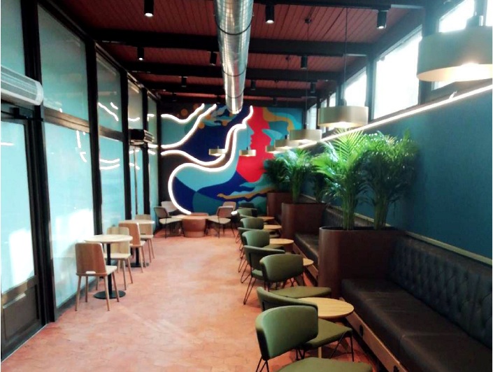El diseño del espacio apuesta por una estética contemporánea y acogedora, donde los tonos cálidos, los materiales naturales y la iluminación estratégicamente distribuida generan una atmósfera que invita a sentirse cómodo y a relajarse lo que favorece la permanencia del cliente. El mobiliario ha sido seleccionado tanto para comodidad como para optimizar el flujo de clientes en un entorno de alto tránsito comercial.