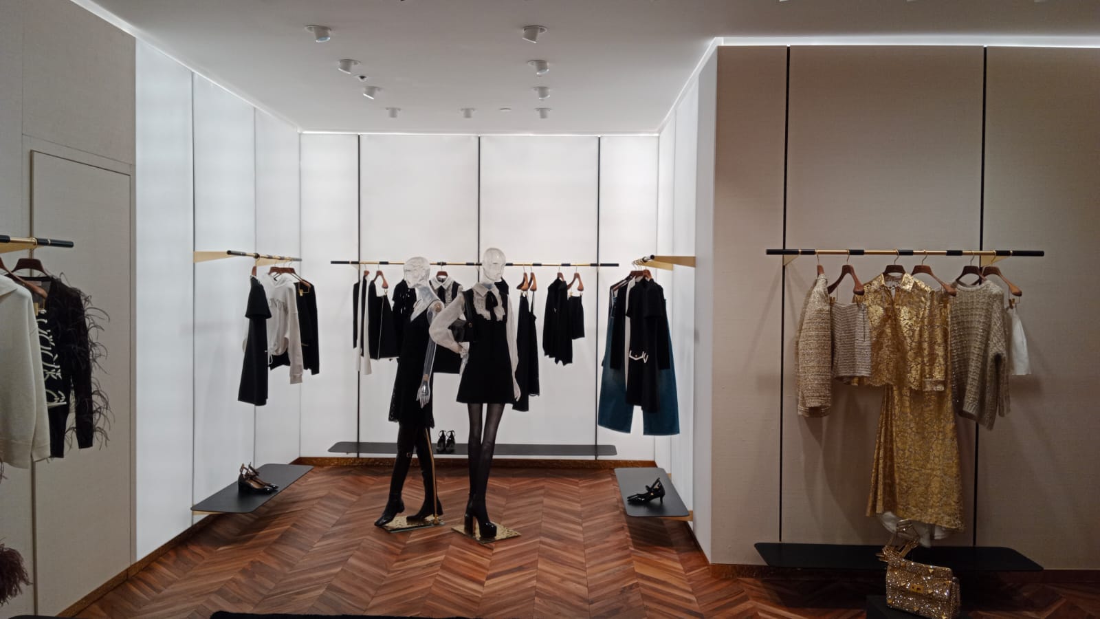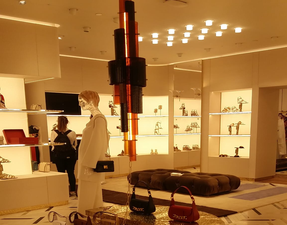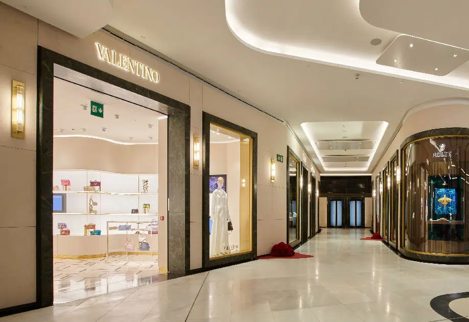El espacio interior ha sido diseñado para reflejar la identidad de Valentino, combinando elegancia contemporánea, sofisticación y un marcado carácter creativo. La selección de materiales nobles, acabados de alta calidad y una paleta cromática refinada se integran en un entorno que potencia la experiencia sensorial del cliente. La iluminación, cuidadosamente estudiada, realza tanto la arquitectura del local como las colecciones expuestas, generando una atmósfera exclusiva y coherente con el posicionamiento premium de la marca.