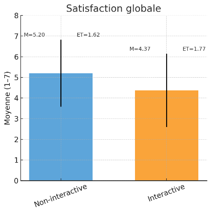 Les résultats montrent des contrastes intéressants : les salles interactives sont jugées plus chaleureuses, mais les salles non interactives apparaissent plus compétentes et, au final, génèrent davantage de satisfaction. Dans ce qui suit, les résultats sont présentés avec la moyenne (M) et l’écart-type (ET) afin de rendre compte à la fois du niveau général et de la dispersion des réponses. Sur la chaleur perçue, l’avantage est net pour la salle interactive (M = 4,72 ; ET = 1,65) comparée à la salle non interactive (M = 3,72 ; ET = 1,80). Les participants décrivent l’ambiance comme plus amicale et accueillante lorsque l’espace favorise les échanges. Pour la compétence, c’est l’inverse : la salle non interactive est évaluée plus positivement (M = 5,25 ; ET = 1,44) que la salle interactive (M = 4,59 ; ET = 1,79). L’agencement sobre et distant semble donc envoyer un signal de sérieux et de professionnalisme. Enfin, la satisfaction globale est également plus forte pour la salle non interactive (M = 5,20 ; ET = 1,62) que pour la salle interactive (M = 4,37 ; ET = 1,77). L’intimité et le calme semblent peser davantage que la convivialité lorsqu’il s’agit de se projeter dans un contexte médical