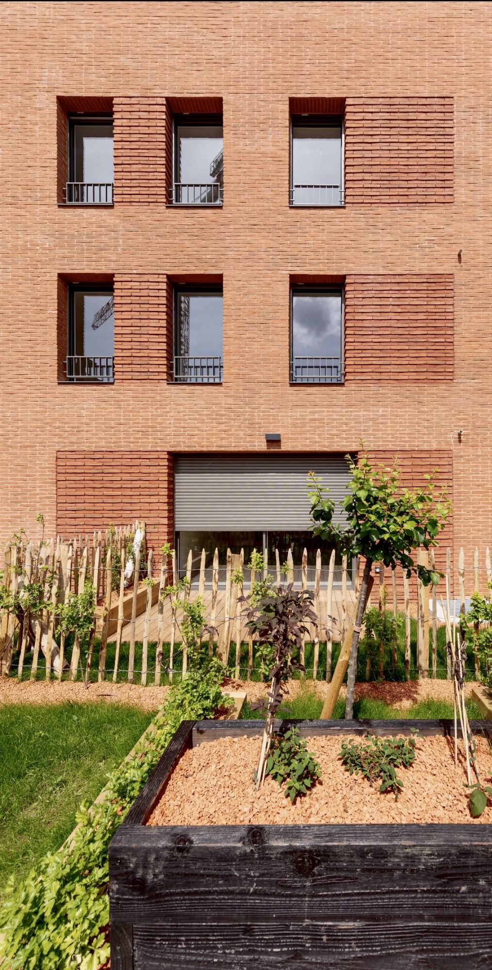 Chaque logement bénéficie d’espaces extérieurs généreux. Le socle dont la massivité est exprimée par la brique trouve